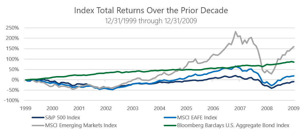Although, with the benefit of hindsight, it is not surprising that the U.S. has outperformed over the past decade1, it’s worth remembering that the prior decade was nearly a mirror image. From the beginning of 2000 to the end of 2009, of the four indices mentioned above, the S&P 500 produced the worst result. Valuations aside, it would appear that the U.S. has the deck stacked in its favor going into the next decade, but we ask investors to remember the prevailing outlook in 1999 and 2009. Investors may have been skeptical in 1999, but there was little outright pessimism—and pessimism was certainly pervasive in 2009. We’re not suggesting that the next decade will look like any of the decades that preceded it; instead, we’re reminding investors of the wide range of outcomes that are possible. Investors’ expectations tend to anchor to their recent experience, but the future is much more uncertain.