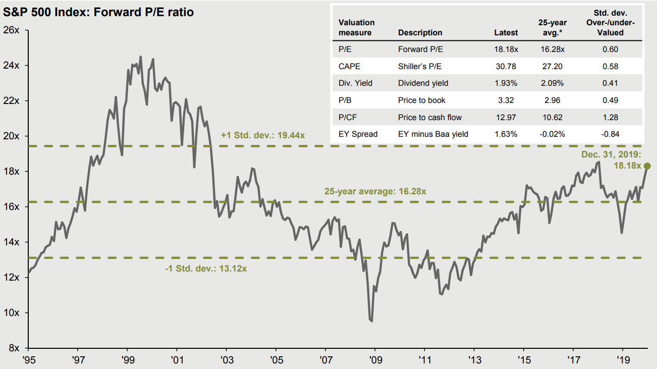 Source: FactSet, FRB, Robert Shiller, Standard & Poor's, Thomson Reuters, J.P. Morgan Asset Management. Price to earning is price divided by consensus analyst estimates of earning per share for the next 12 months as provided by IBES since January 1995, and FactSet for December 31, 2019. Average P/E and standard deviations are calculated using 25 years of IBES history. Shiller's P/E uses trailing 10-years of inflation-adjusted earnings as reported by companies. Dividend yield is calculated as the next 12-month consensus dividend divided by most recent price. Price to book ratio is the price divided by book value per share. Price to cash flow is price divided by NTM cash flow. EY minus Baa yield is the forward earnings yield (consensus analyst estimates of EPS over the next 12 months divided by price) minus the Moody's Baa seasoned corporate bond yield. Std. dev. over-/under-valued is calculated using the average and standard deviation over 25 years for each measure. *P/CF is a 20-year average due to cash flow data availability. Guide to the Markets – U.S. Data are as of December 31, 2019.